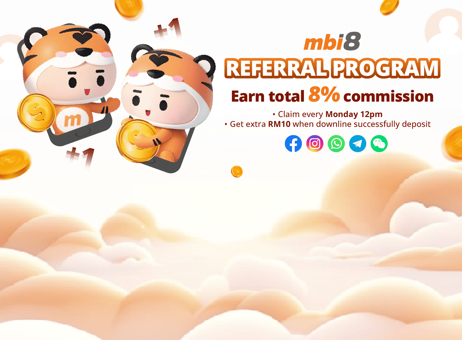Free Share Bonus (Referral Bonus): mbi8’s referral program lets you earn bonuses by sharing the fun with friends. When you refer new players (using your referral code or link), you can get a “free share” bonus, usually in the form of a commission or credit once your friends sign up or make deposits. In fact, mbi8 offers up to an 8% commission for downline referrals (i.e. a portion of your referrals’ deposits) as a reward for bringing in new players, according to promotions. Top referrers can earn substantial weekly commissions (some reports mention up to MYR 2,000 weekly through referral programs).This not only helps the platform grow, but also gives you a chance to make extra money by simply inviting others.